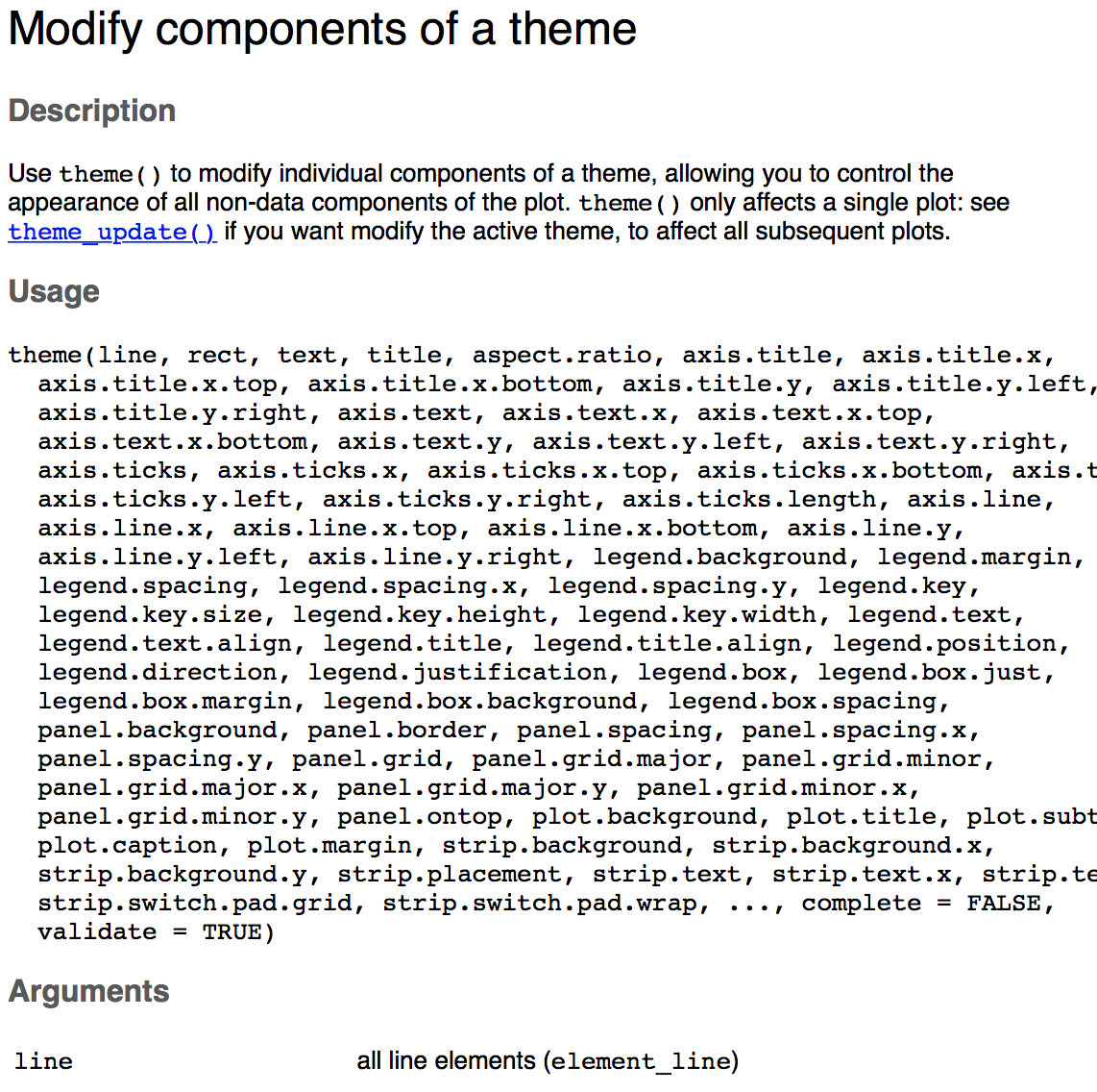 ggplot(data, aes(x, y, color, size, shape, linetype, fill, alpha, label, family, width, hjust, vjust, ...))