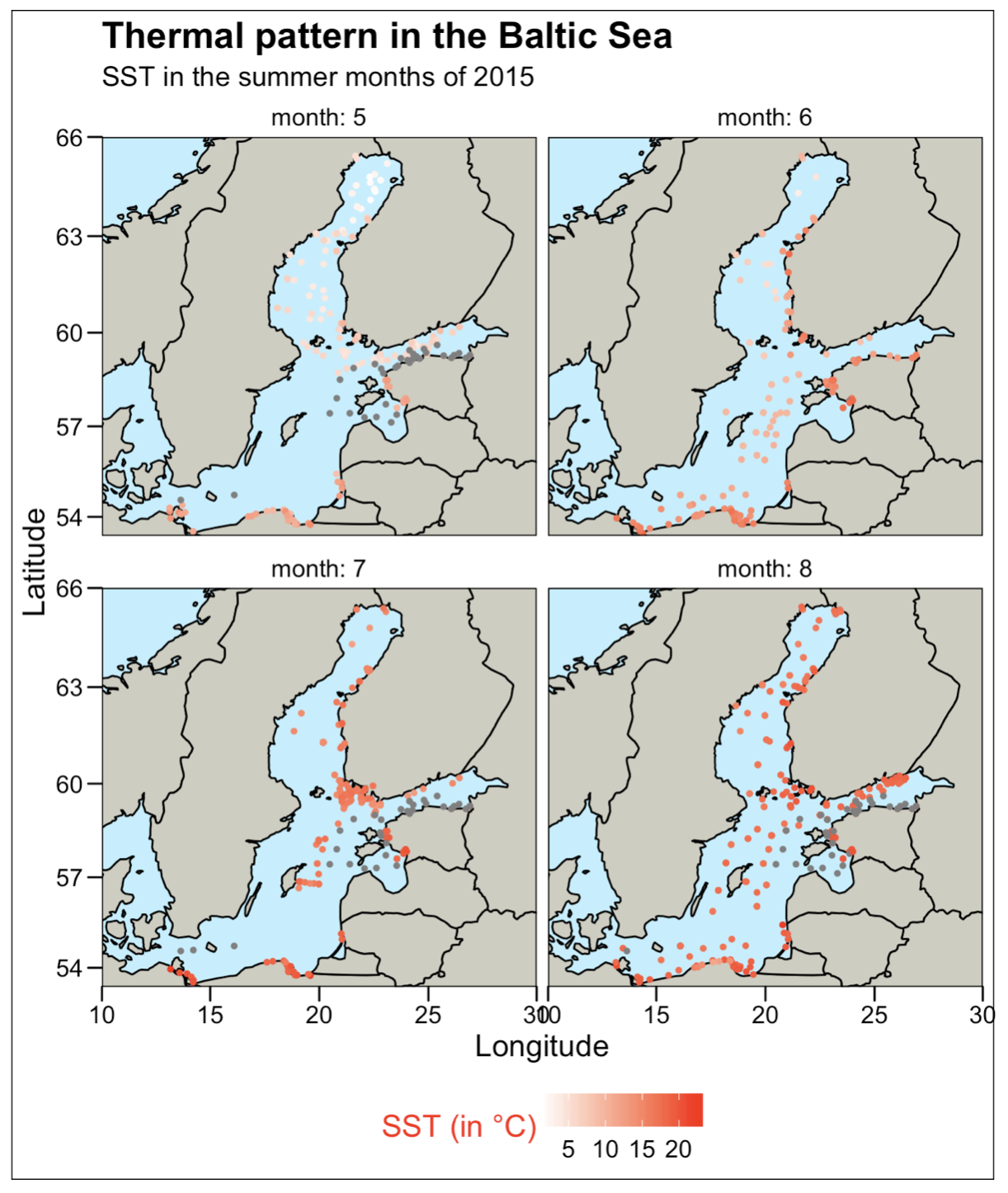 Explore spatial patterns of summer sea surface temperature in the Baltic Sea graphically: