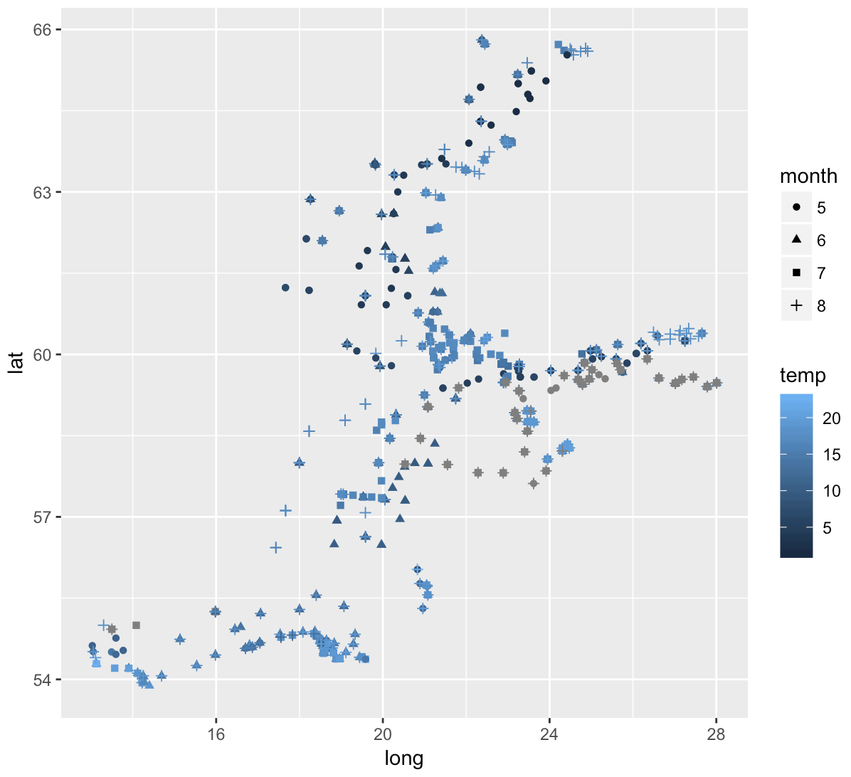 baltic + geom_point(data = sst_sum, aes(x = long, y = lat, colour = temp), size = 1) +